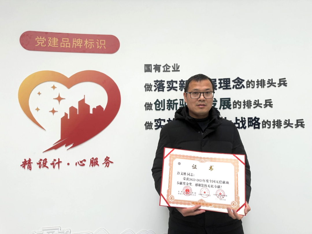 近日,集團所屬設(shè)計總院員工許文勝同志榮獲由國家衛(wèi)生健康委員會、中國紅十字會總會、中央軍委后勤保障部衛(wèi)生局頒發(fā)的“2022—2023年度全國無償獻(xiàn)血獎金獎”,以表彰他二十年如一日的無償奉獻(xiàn)。