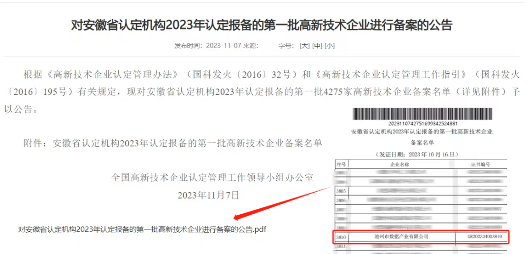 11月7日,全國高新技術企業(yè)認定管理工作領導小組辦公室發(fā)布《對安徽省認定機構2023年認定報備的第一批高新技術企業(yè)進行備案的公告》,池州市數(shù)據(jù)產業(yè)有限公司名列其中,榮獲2023年度第一批認定的高新技術企業(yè)。