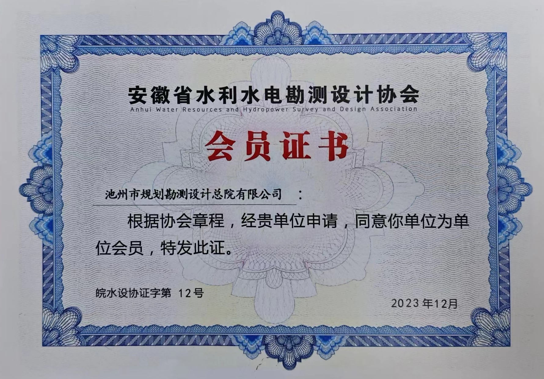 2023年12月27日,安徽省水利水電勘測(cè)設(shè)計(jì)協(xié)會(huì)第三屆會(huì)員大會(huì)在合肥召開,省民政廳、省水利廳、中國(guó)水利水電勘測(cè)設(shè)計(jì)協(xié)會(huì)等單位領(lǐng)導(dǎo)蒞臨指導(dǎo),全省40多家會(huì)員單位代表參加。會(huì)議選舉產(chǎn)生了新一屆協(xié)會(huì)理事、監(jiān)事單位,池州市規(guī)劃勘測(cè)設(shè)計(jì)總院有限公司新當(dāng)選為第三屆理事會(huì)理事單位,總院黨支部副書記、副總經(jīng)理左江同志當(dāng)選為第三屆理事會(huì)理事。