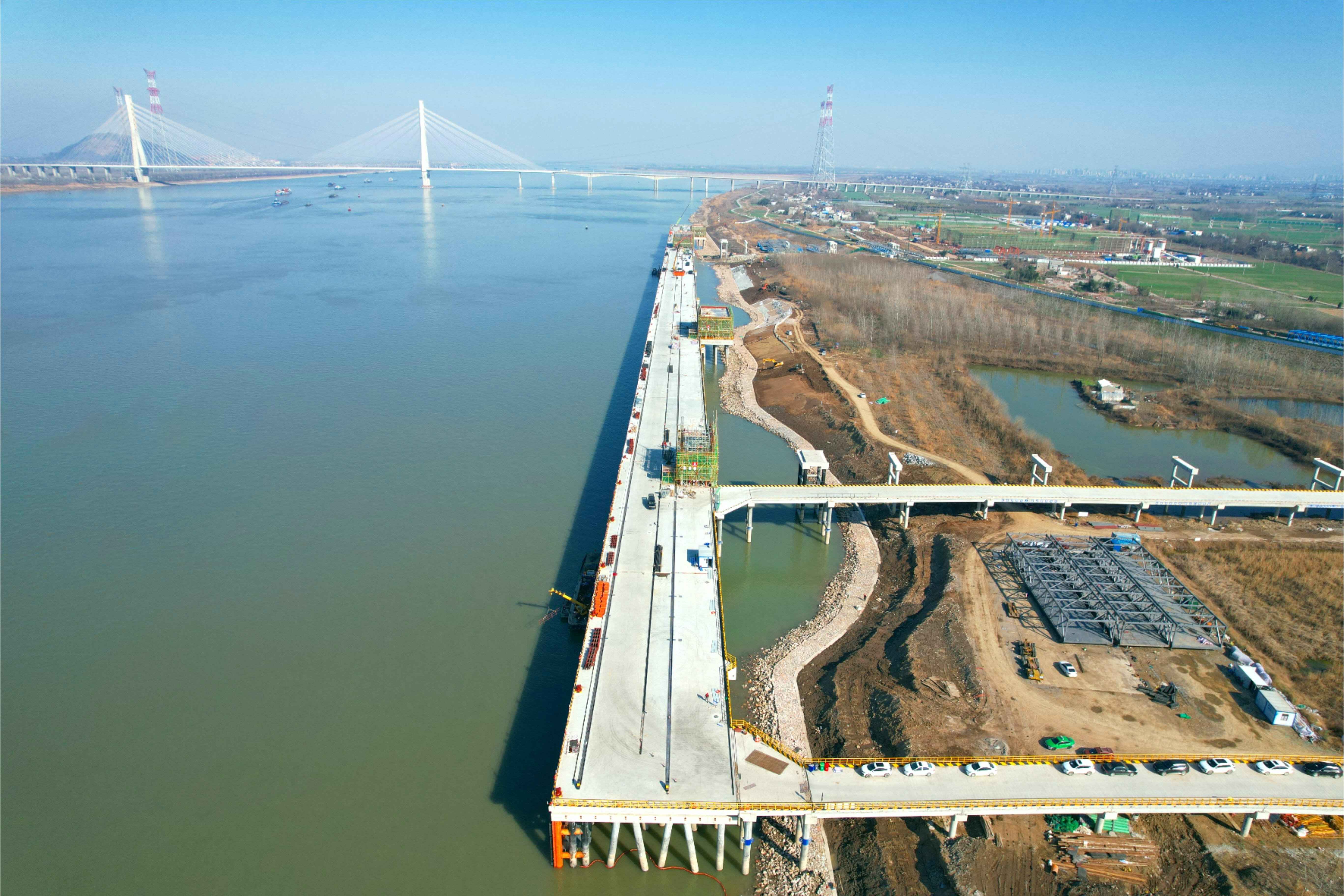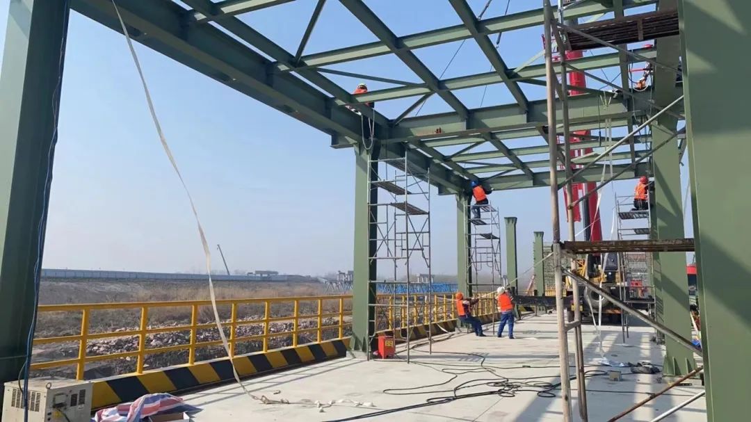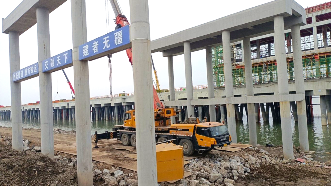 截至目前,項目水域部分碼頭平臺面層、兩座汽車引橋已全部澆筑完成,項目整體進度已完成約83%,碼頭工程主體結(jié)構(gòu)與房建工程主體結(jié)構(gòu)已全部施工完成,正在進行碼頭前沿鋼結(jié)構(gòu)安裝、裝船機焊接打磨進行拼焊、房建工程進行內(nèi)部砌墻、鋼引橋吊裝、水域部分進行系纜欄桿安裝、橡膠護舷安裝、鋼軌安裝。碼頭陸域部分已進場工作,臨時道路及部分場地硬化已完成,正在進行B2轉(zhuǎn)運樓及管理用房區(qū)域內(nèi)基礎(chǔ)施工,水泥攪拌樁已開展工作。